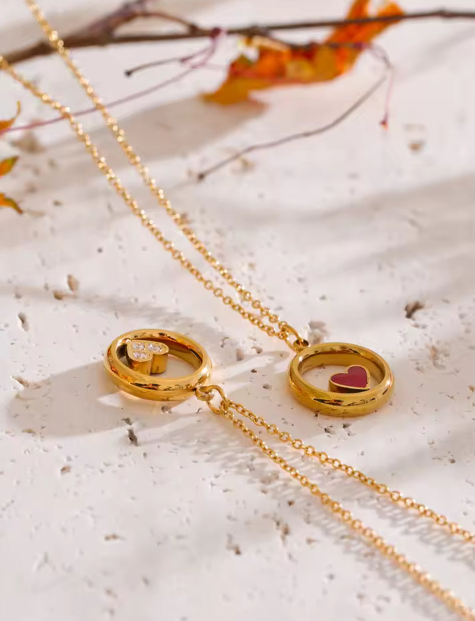 Cadena de acero inoxidable enchapado en oro de 18k con dije doble de corazón de enamel y corazón con microcirconias