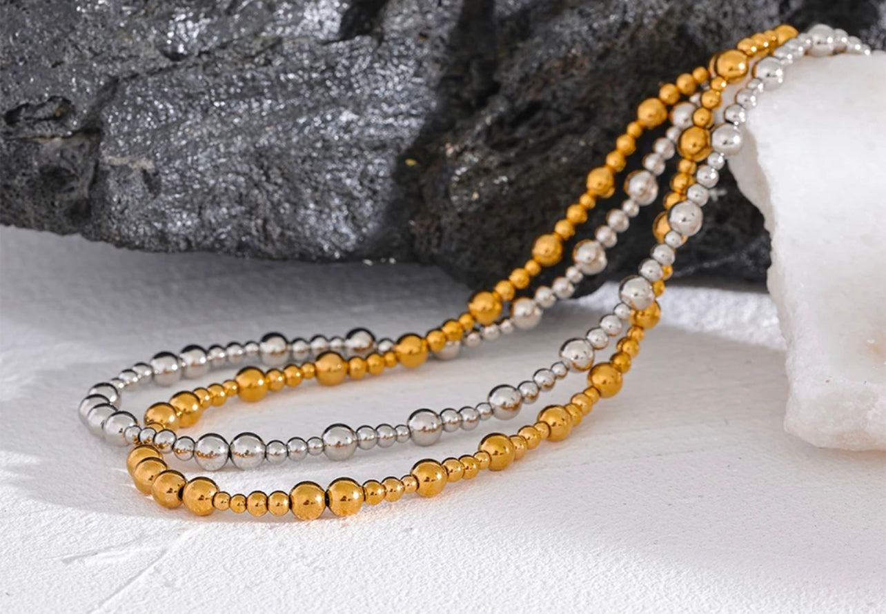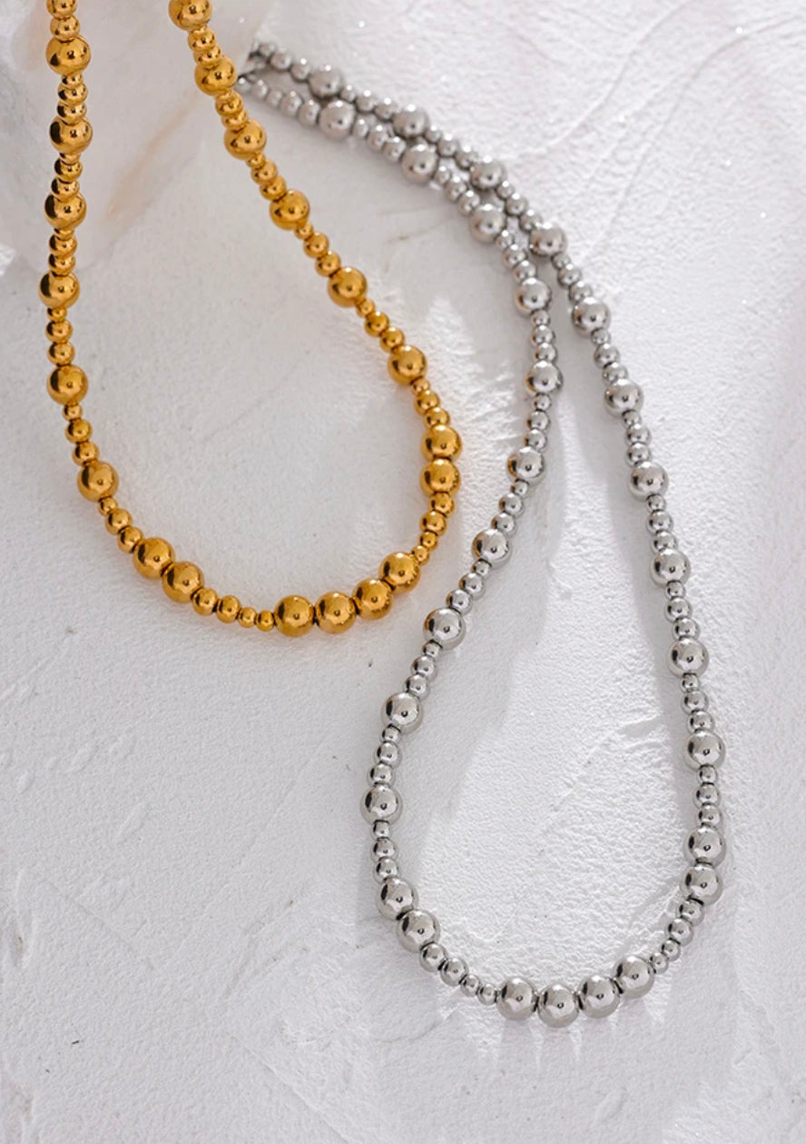 Collar de cuentas doradas de acero inoxidable enchapado en oro real de 18k, impermeable e hipoalergénico. Dorado disponible solamente.