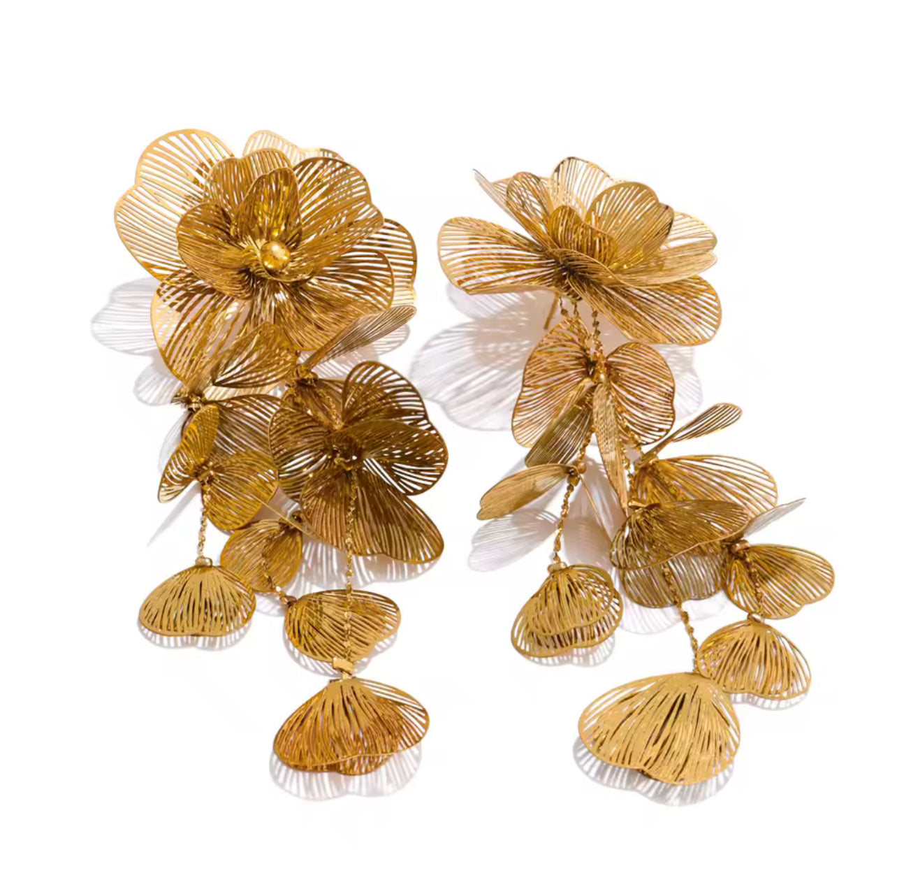 Aretes de acero inoxidable enchapado en oro de 18k con flores exageradas color dorado