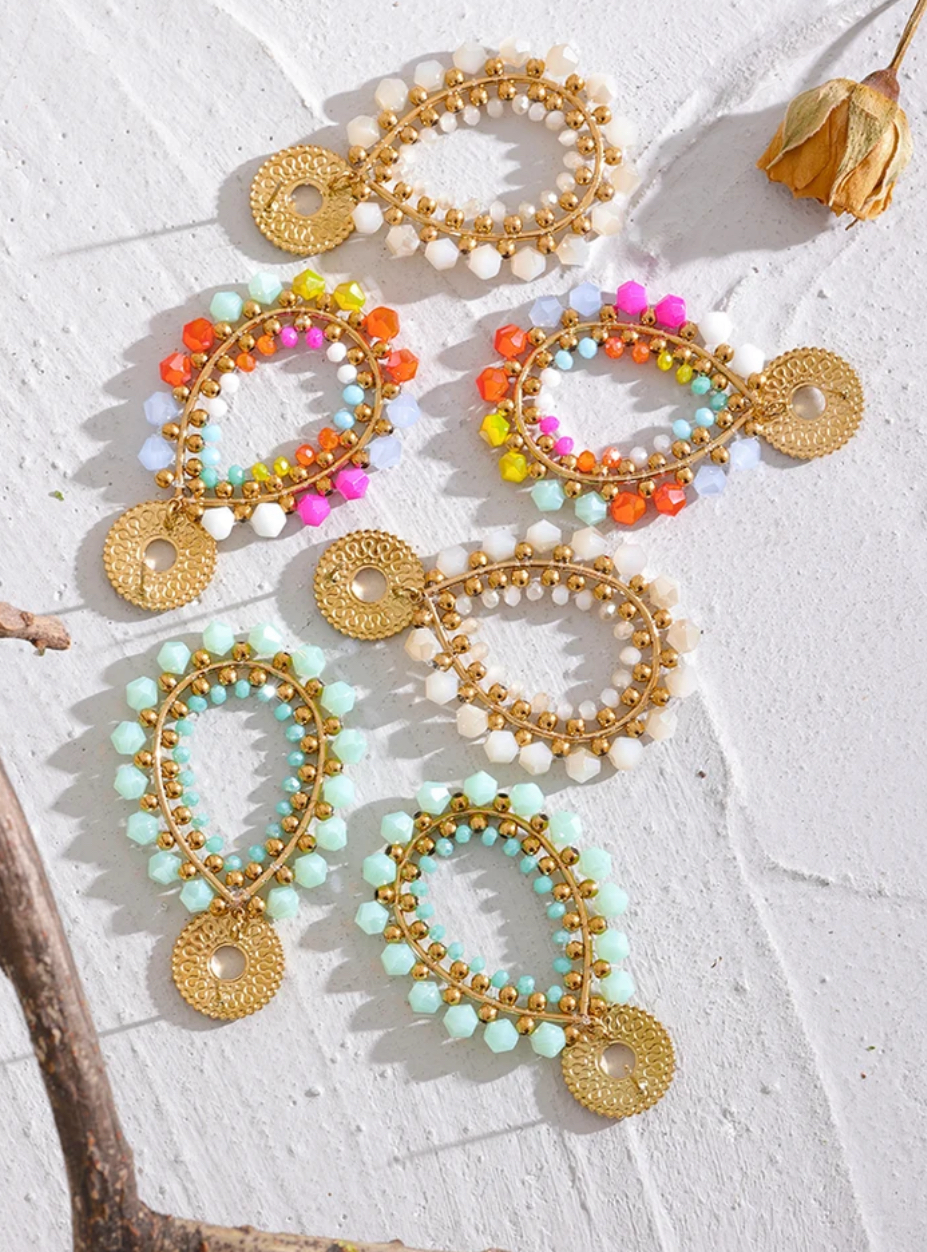 Pendientes colgantes geométricos de acero inoxidable, aretes coloridos con cuentas de cristal, joyería exquisita hecha a mano.