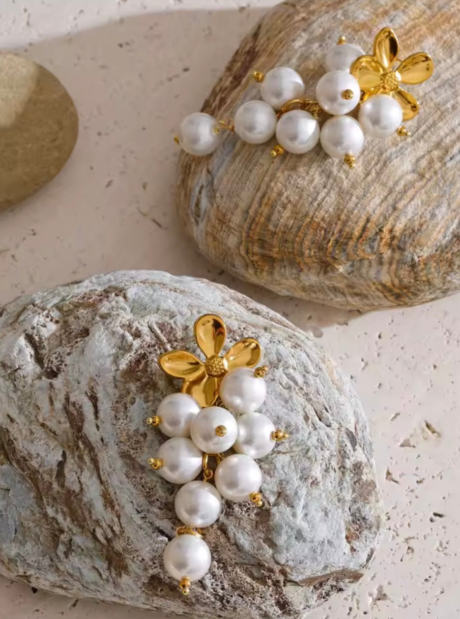 Aretes de perlas en lluvia y flor de acero inoxidable 316L enchapado en oro 18kpvd y perlas sintéticas