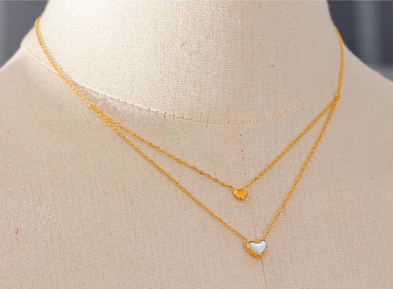 La cadena amor doble capa está compuesta por acero inoxidable con dijes de acero y hermosas conchas nácar naturales, lo que la convierte en una cadena de estilo coreano super chic y duradera. Dale un toque de elegancia a tu estilo con esta cadena única que seguramente te robará miradas.