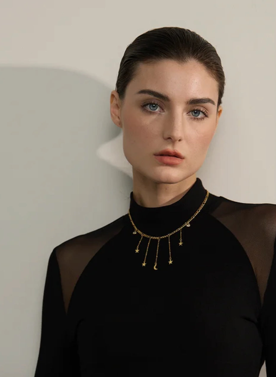 La cadena Lluvia de Estrellas es la elección perfecta para agregar un toque de elegancia a tu outfit. Hecha de acero inoxidable, sus dijes en caída de estrellas y luna enchapados en oro de 18 k le otorgan un toque único y sofisticado. ¡Luce radiante con este nuevo estilo!