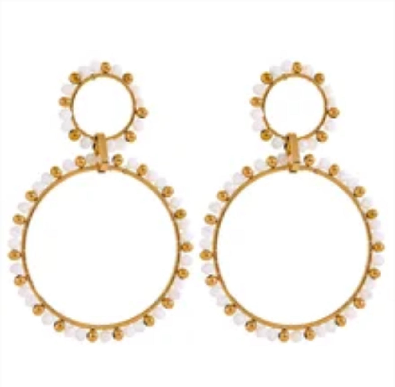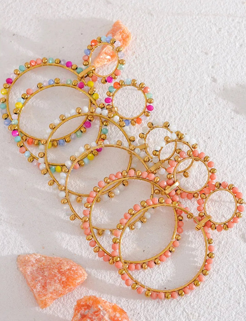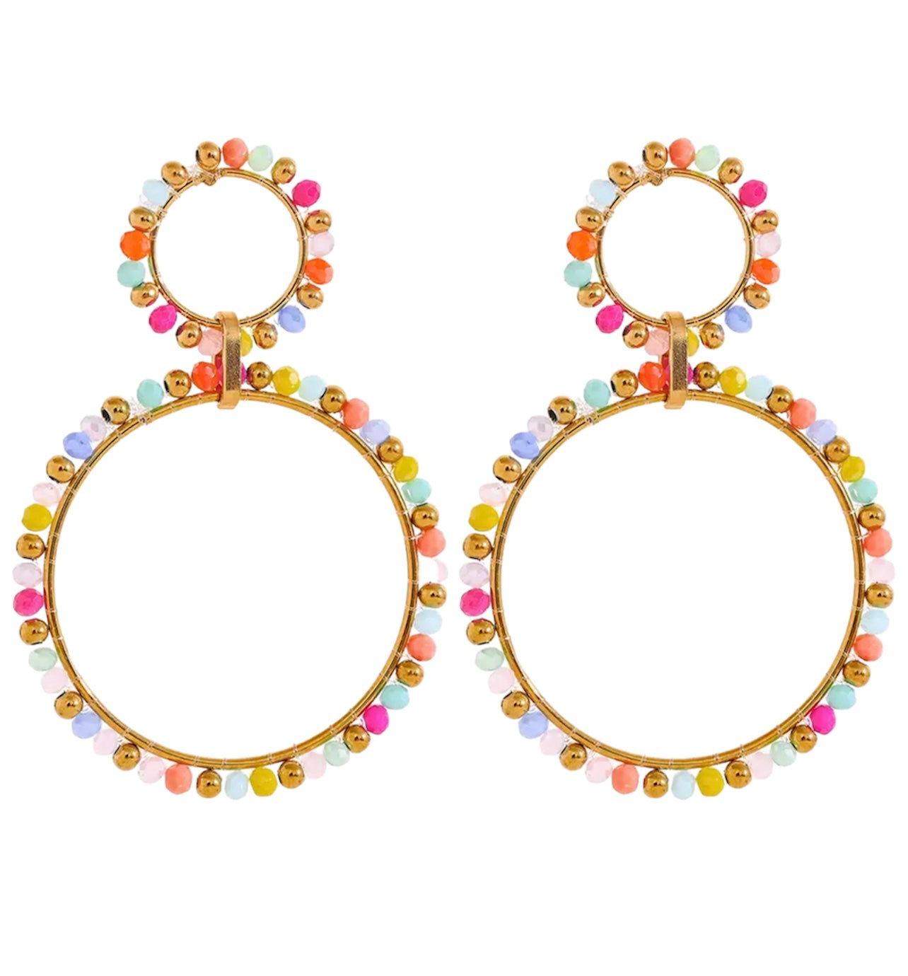 Los Circulos de Cristales son los aretes perfectos para un look de verano. Confeccionados en acero inoxidable, estos aretes son livianos y presentan un diseño de doble círculo con cristales de colores. Dale un toque de brillo y color a tus outfits con estos hermosos aretes.