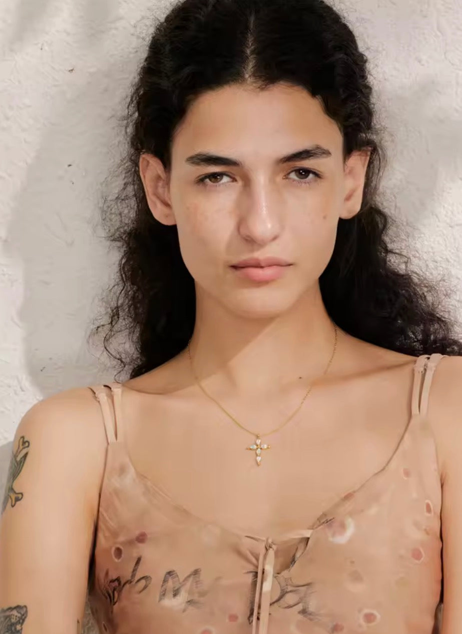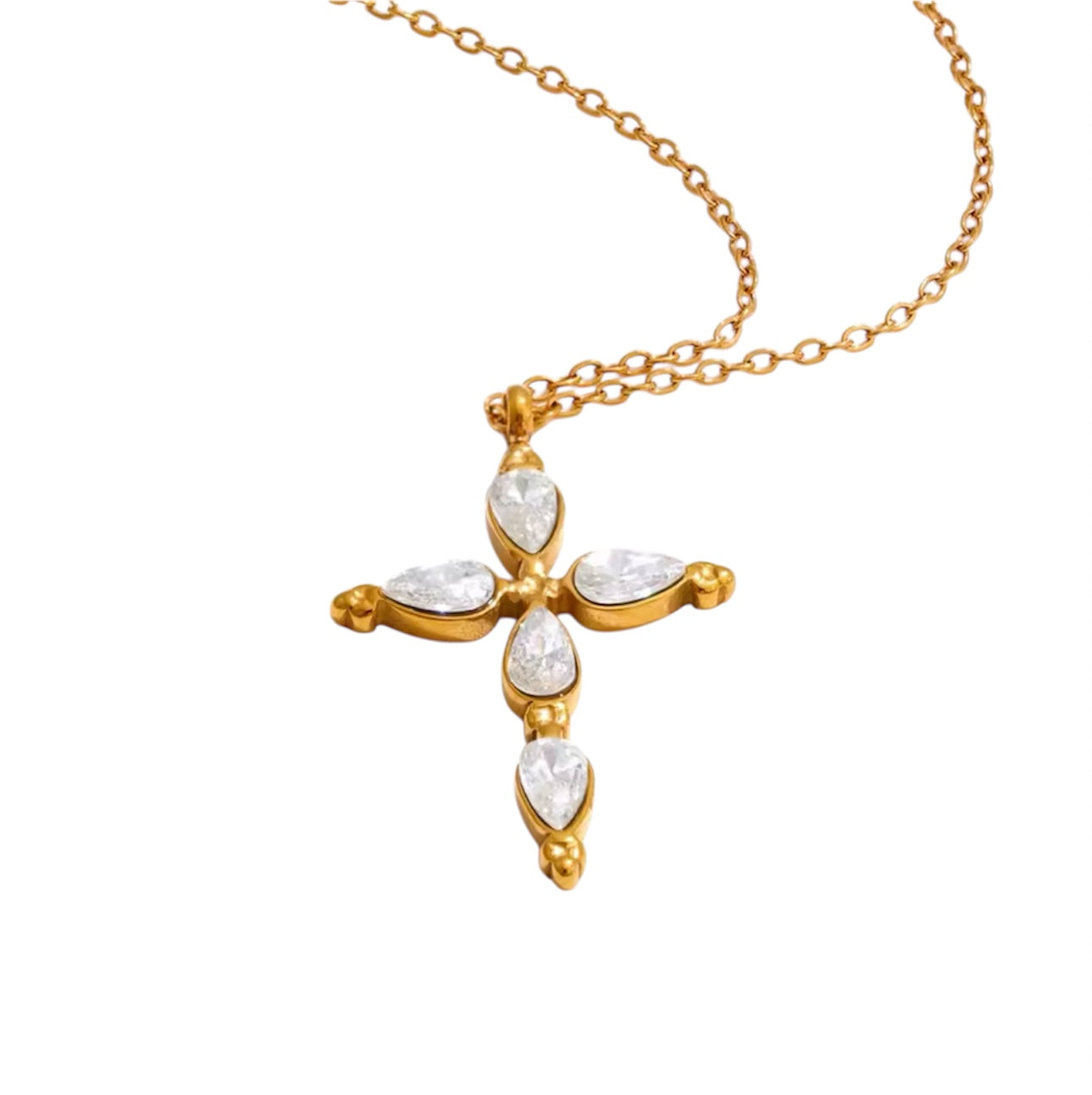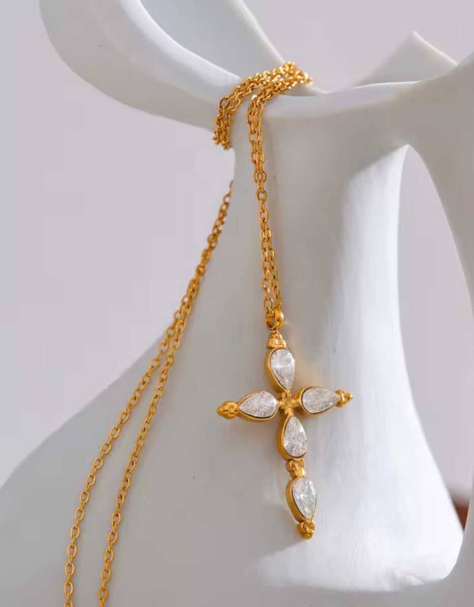 Cadena de acero inoxidable en forma de cruz con hojitas de cristal enchapado en oro 18k pvd