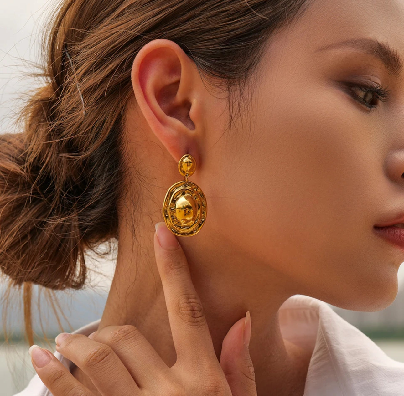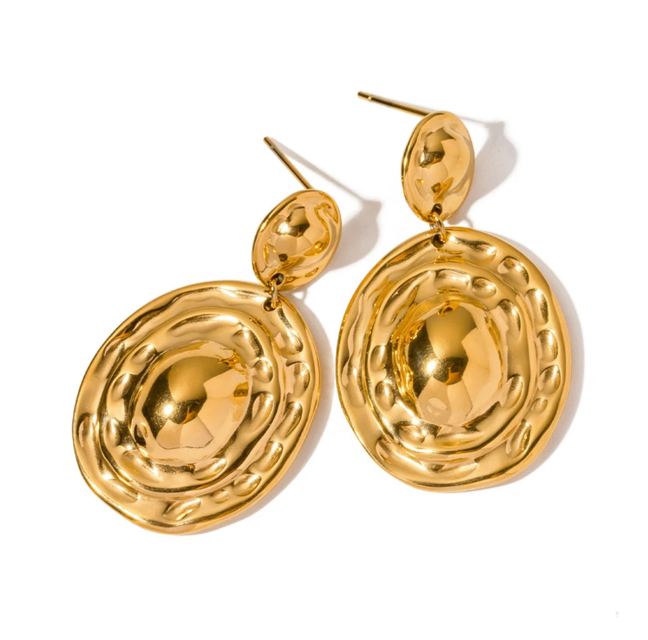 Estos aretes colgantes de circulos geometricos texturizados de acero inoxidable enchapados en oro 18k tienen un diseño moderno y elegante. El material de acero inoxidable asegura su durabilidad y resistencia, mientras que el enchapado en oro 18k le da un toque de sofisticación. Son perfectos para cualquier ocasión y nunca pasan de moda.
