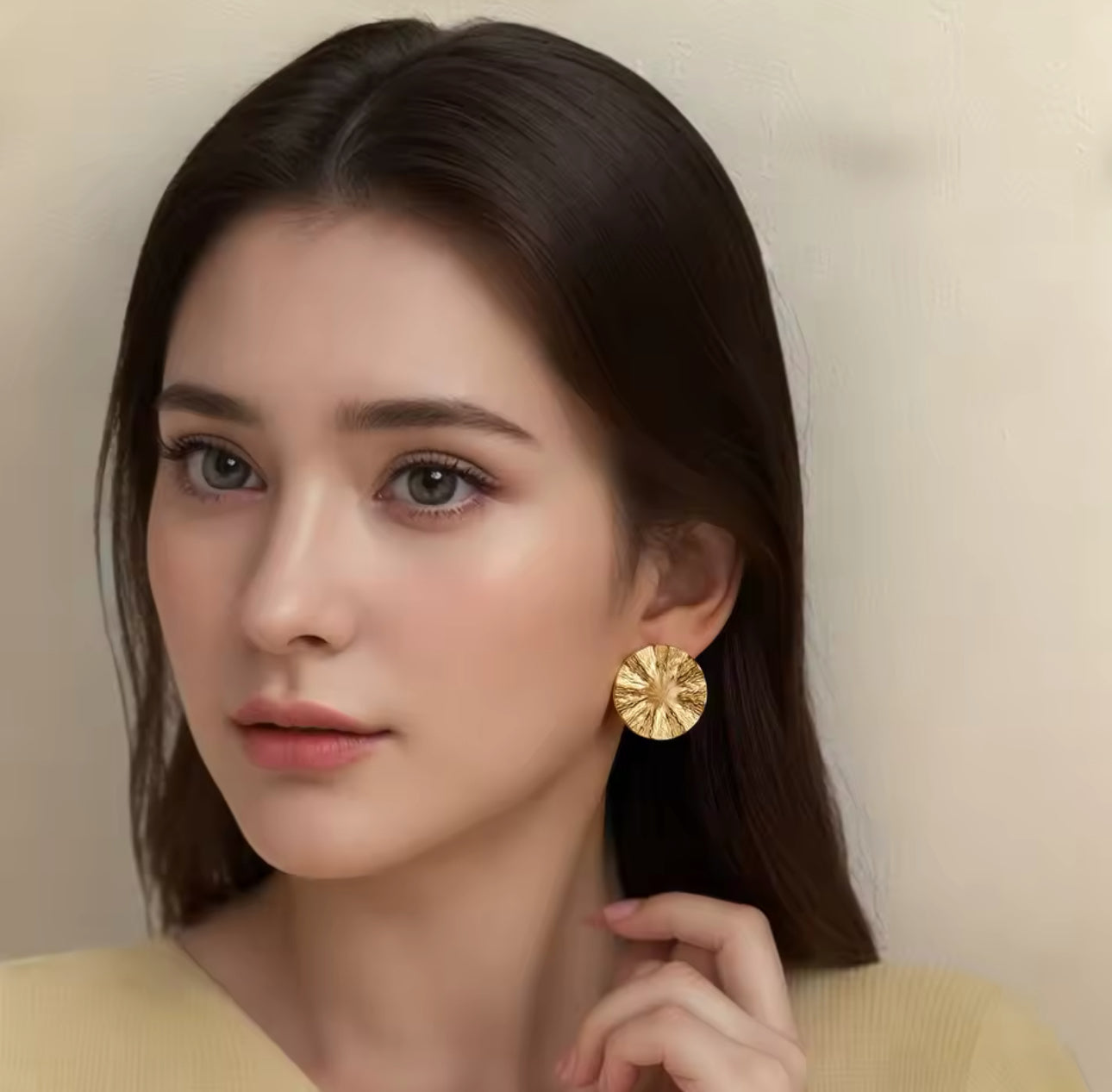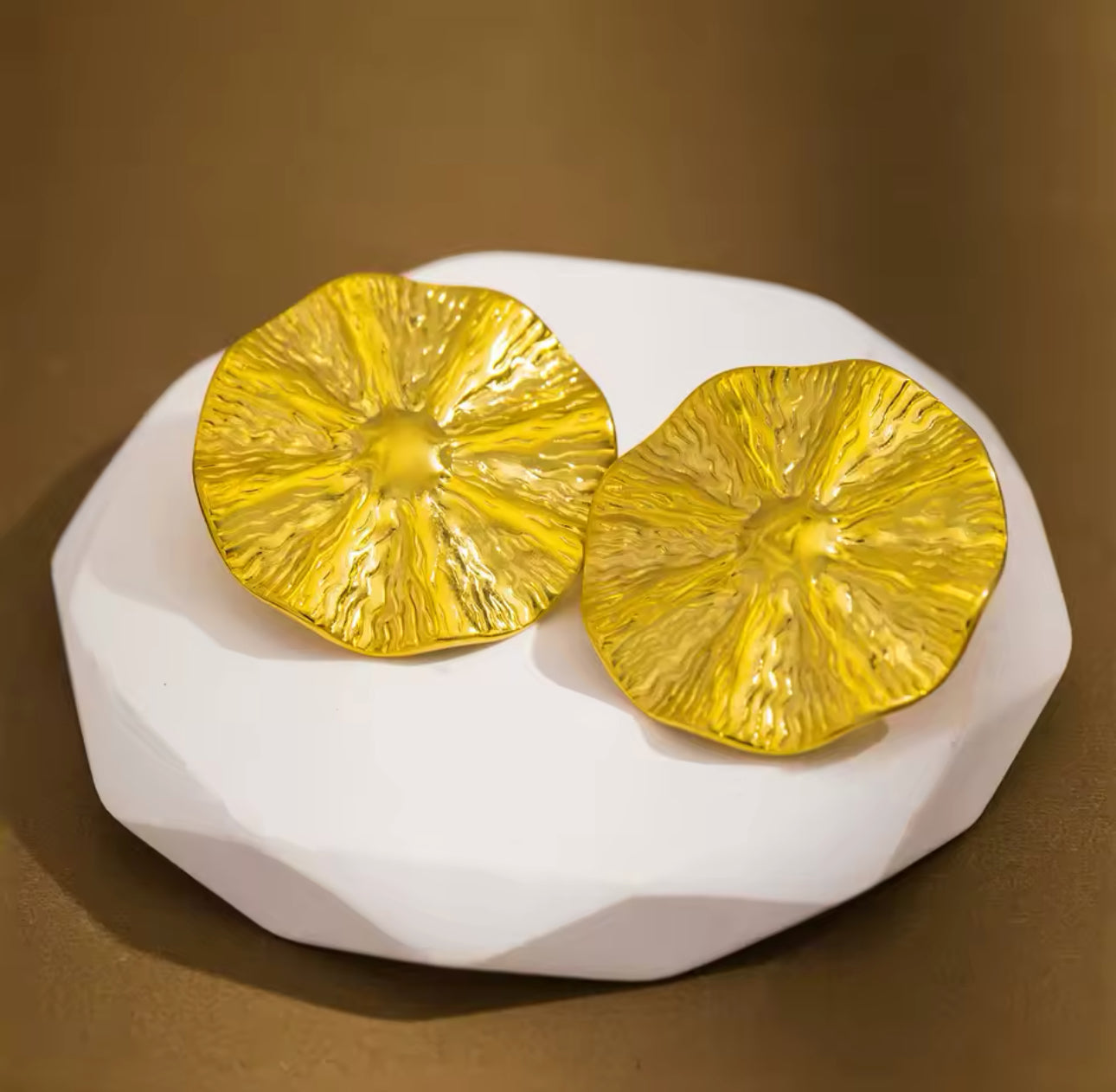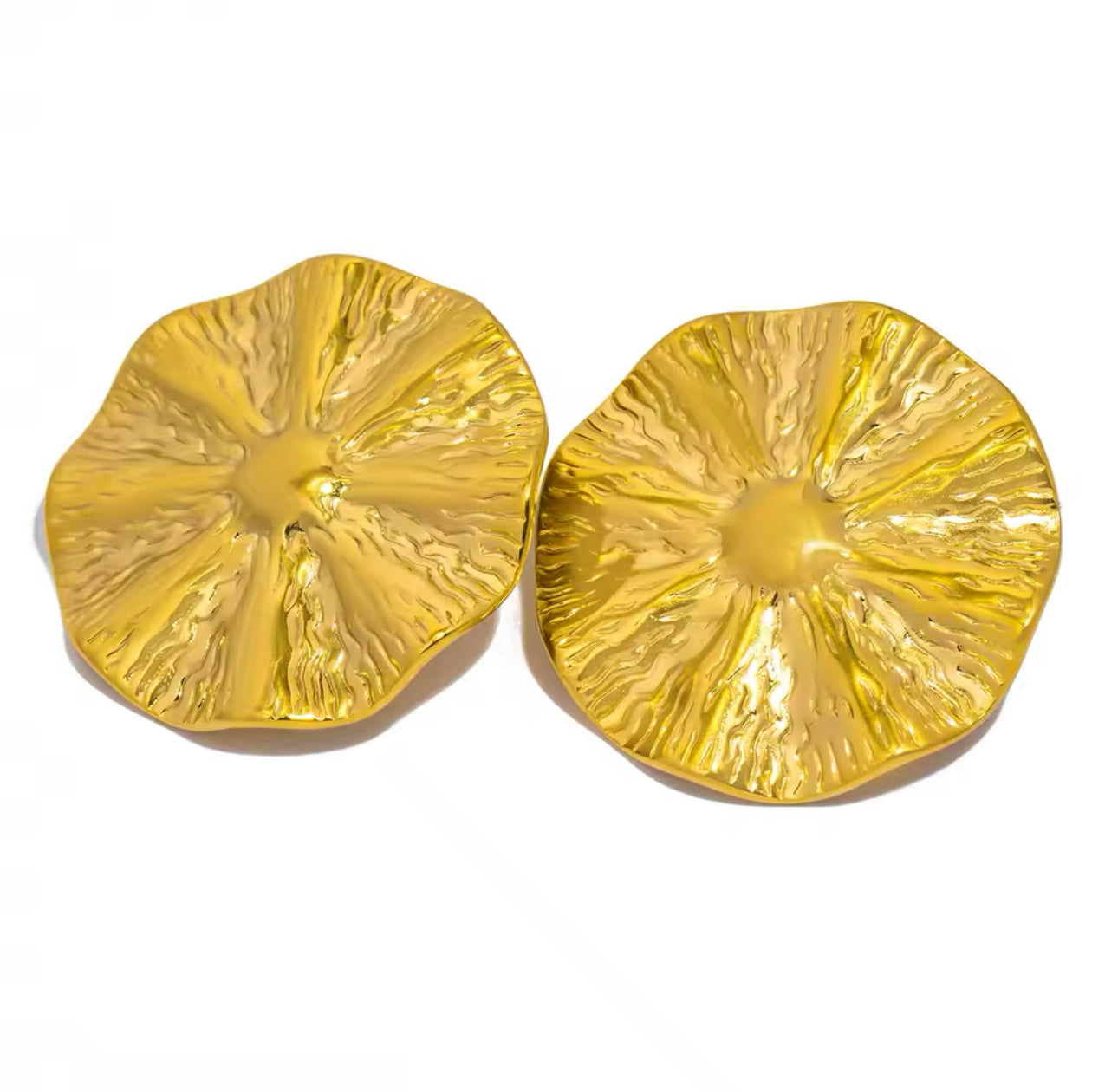 Estos aretes redondos plegables son el accesorio perfecto para el uso diario. Con un diseño elegante de flor grande, están hechos de acero inoxidable y están enchapados en oro de 18k para una durabilidad y brillo duraderos. Añade un toque de estilo y sofisticación a cualquier atuendo con estos hermosos aretes.