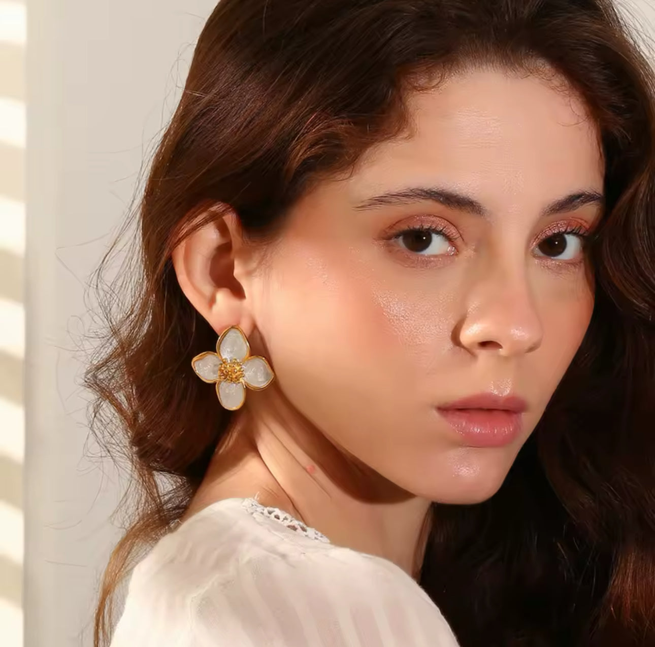 Aretes en forma de flor tono blanco de acero inoxidable 316L enchapado en oro real de 18K.