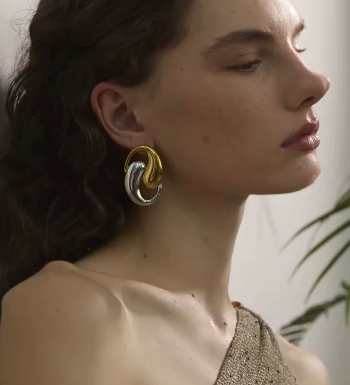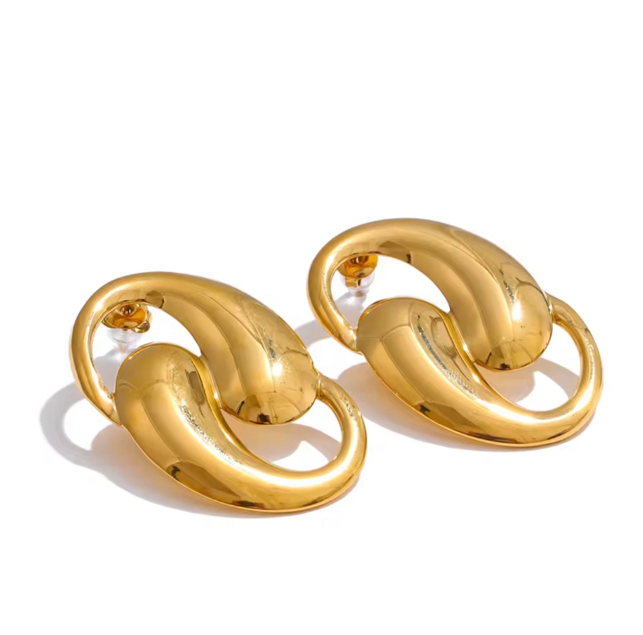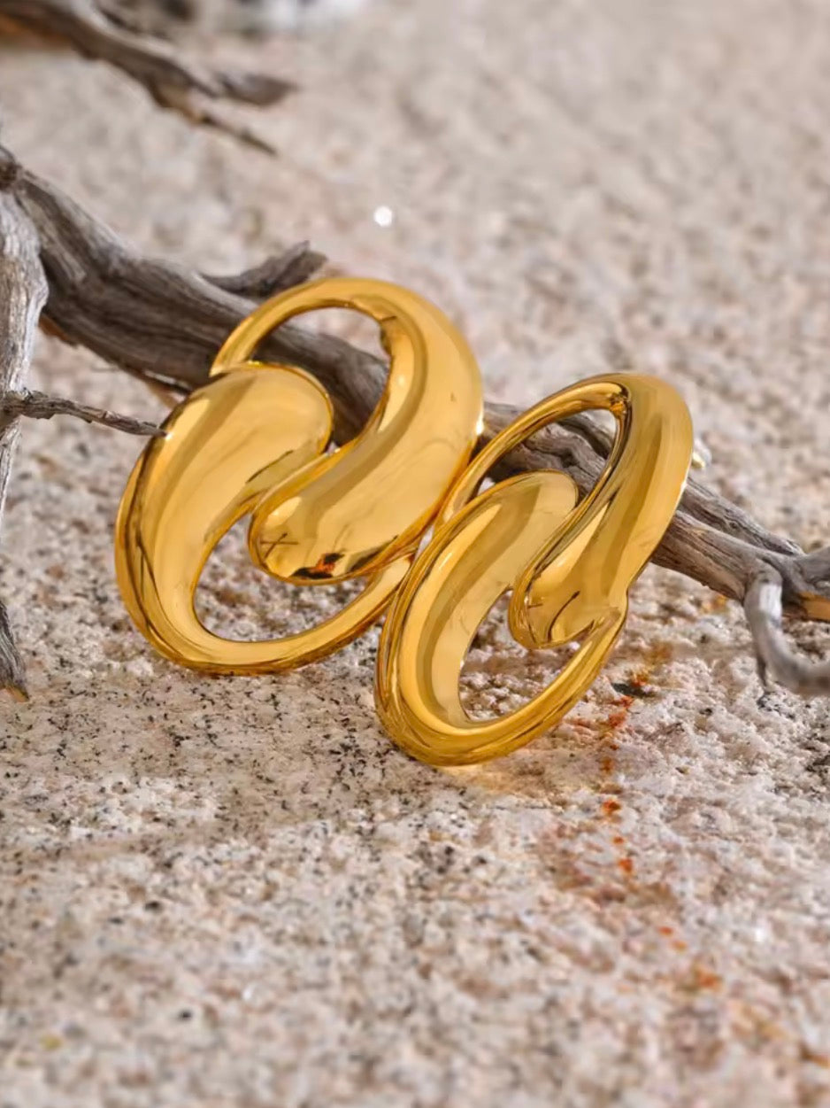 Pendientes grandes geométricos en forma de peces dorados girando entre sí. De acero inoxidable PVD18k para toda ocasión.