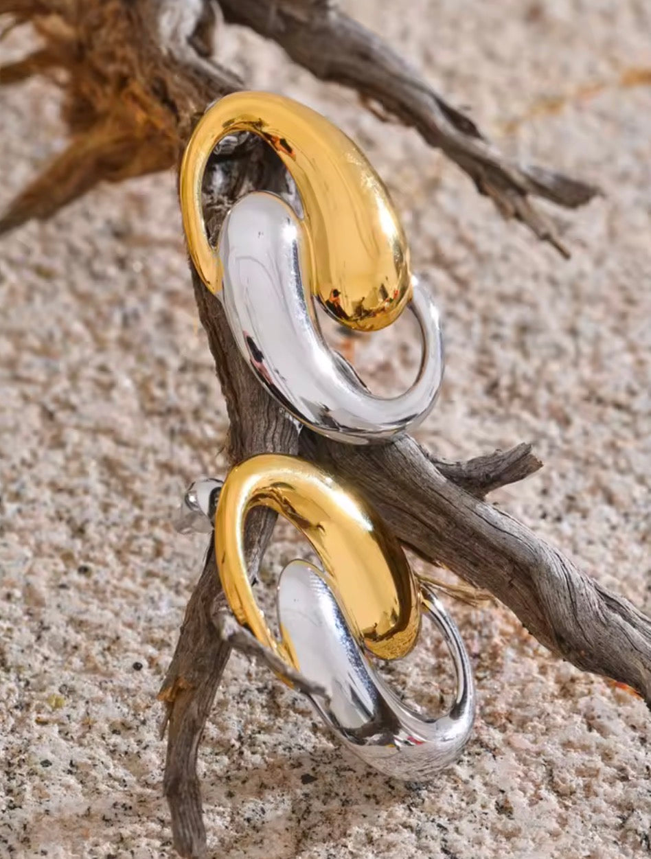 Aretes de acero inoxidable en forma de peces dorado combinado con color plateado. Enchapado en oro de 18k y platino PVD.