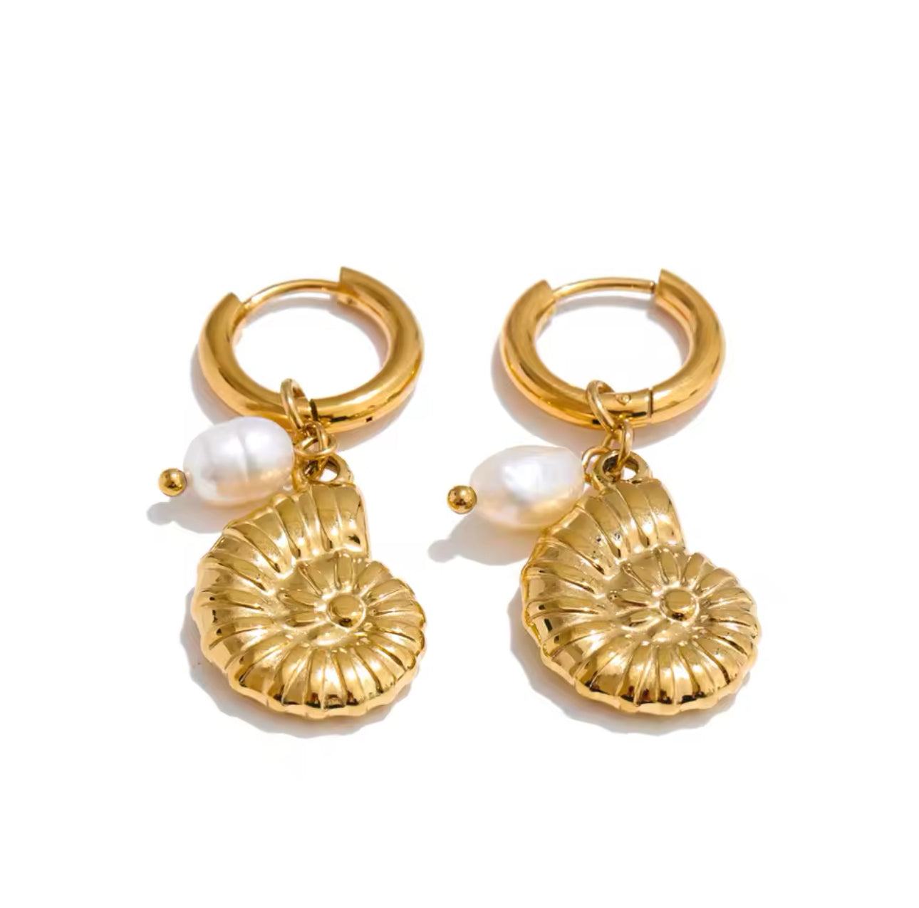 Huggies de acero inoxidable enchapado en pvd oro 18k en forma de caracol con perlas naturales de río