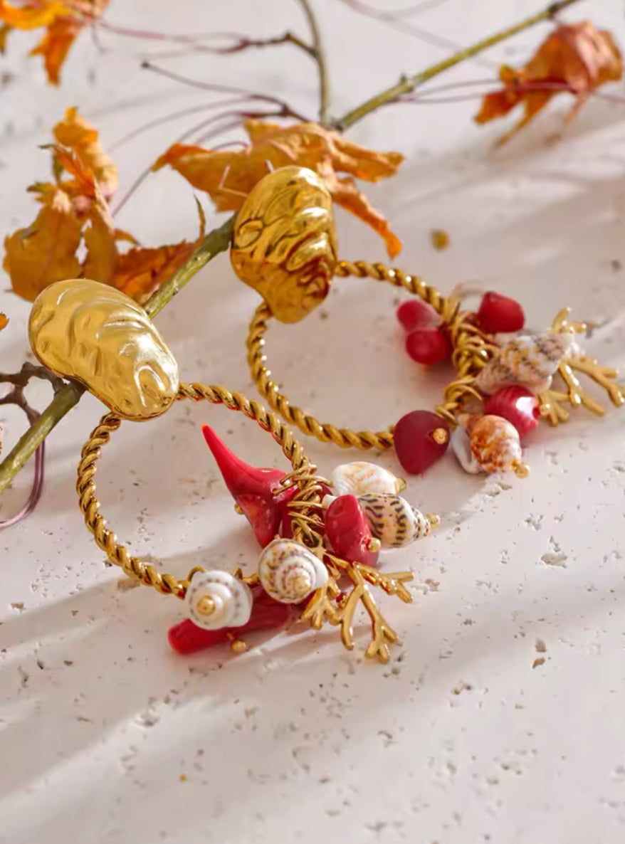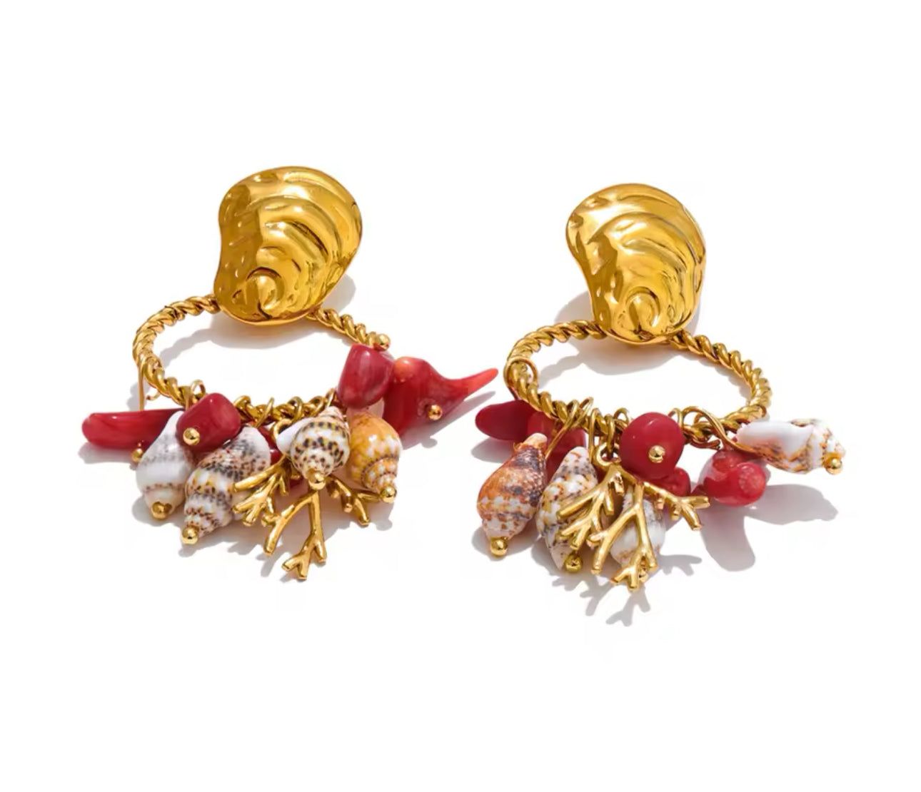 Aretes Colgantes de gota de concha de piedra natural roja de acero inoxidable enchapado en pvd oro 18k