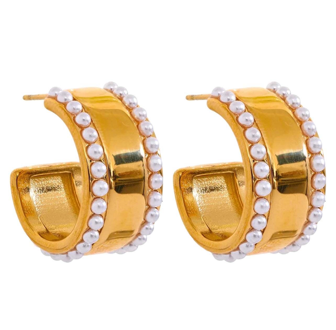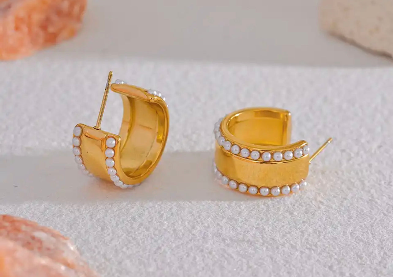 Aretes de acero inoxidable enchapados en oro real de 18k, impermeables e hipoalergénicos. Con incrustaciones de perlas acrílicas.