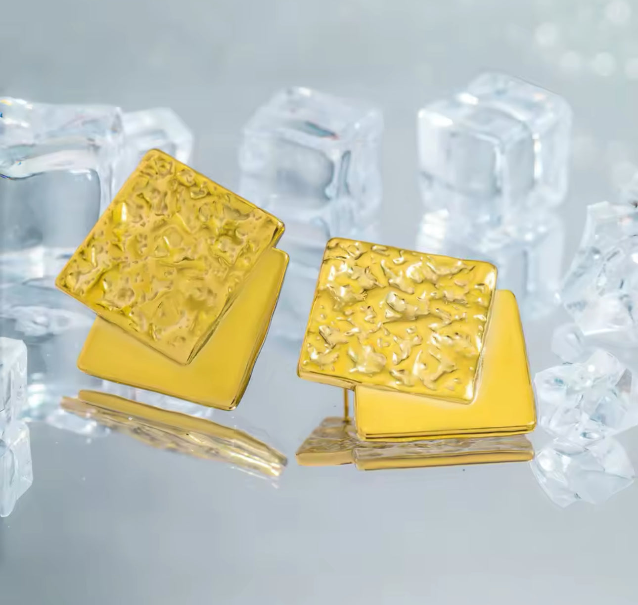 Los Pendientes Cuadrados Martillados son un accesorio de moda que combina elegancia y resistencia. Están hechos de acero inoxidable con recubrimiento en oro de 18k, lo que los hace impermeables. Sus diseños geométricos, mitad lisos y mitad martillados, le dan un toque moderno y versátil a tu look.