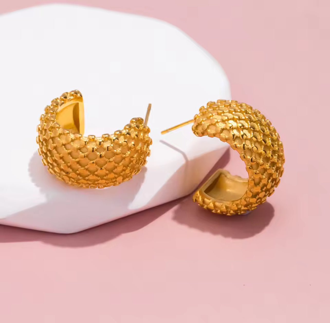 Estos aretes en forma de "C" con diseño de piña están elaborados en acero inoxidable y cuentan con un baño de oro de 18k, lo que garantiza su resistencia y durabilidad para uso diario. Su estilo moderno y elegante los convierte en un accesorio versátil que complementa cualquier atuendo, aportando un toque de sofisticación y frescura. Perfectos para quienes buscan combinar moda y calidad en piezas que perduran.