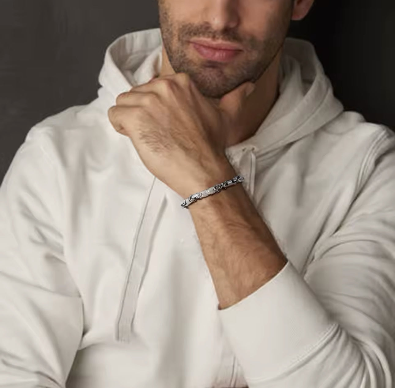 Pulseras de acero inoxidable para hombre en tono dorado, plateado y negro.