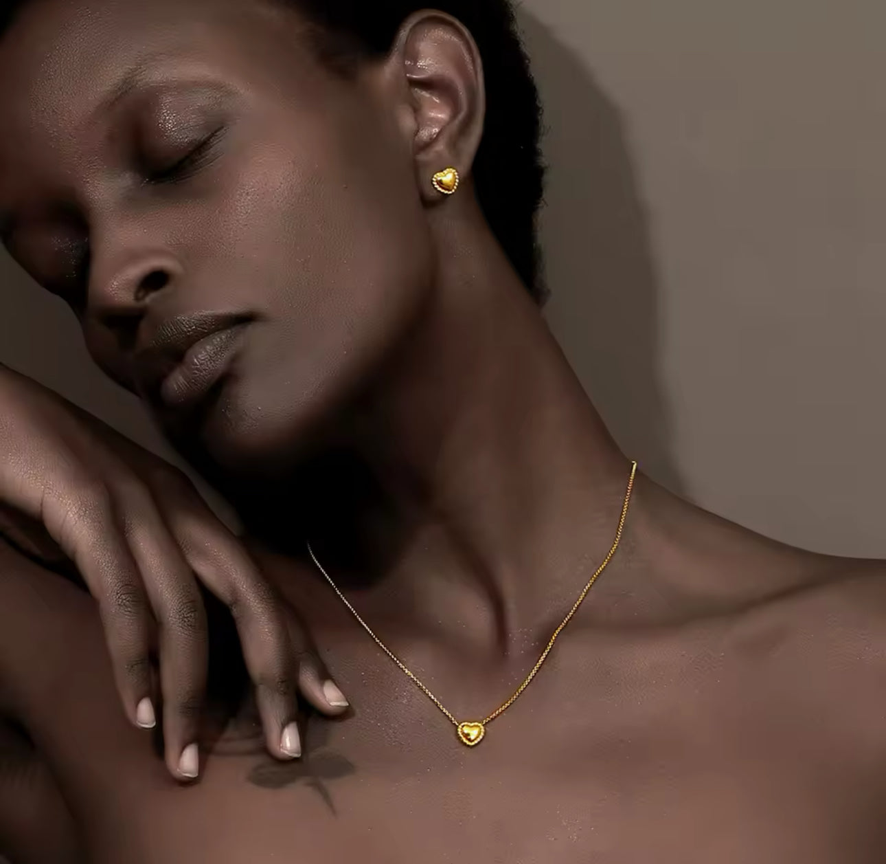 Conjunto de mini aretes de corazón y cadena con dije de corazón de acero inoxidable enchapado en oro real de 18k.