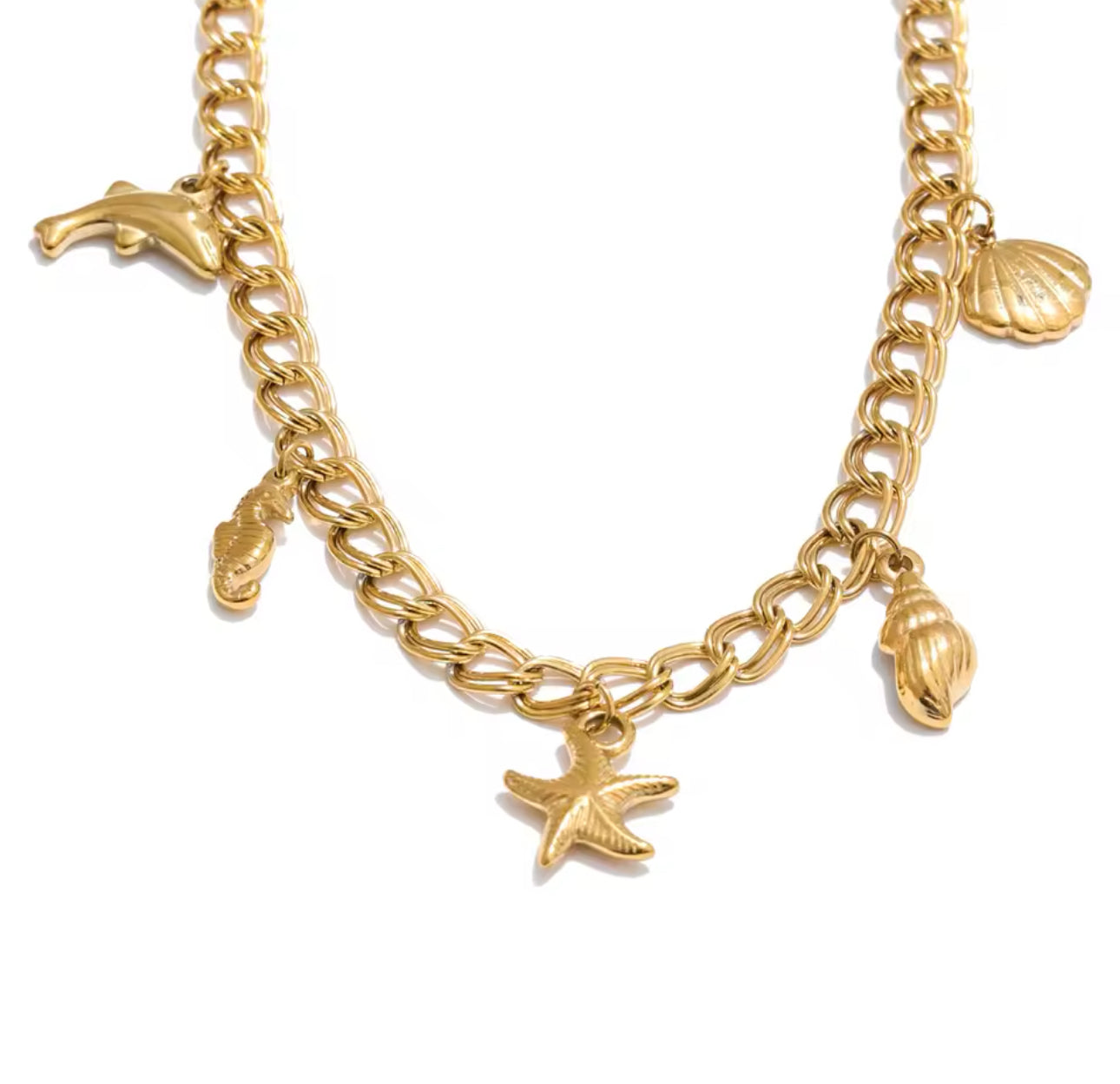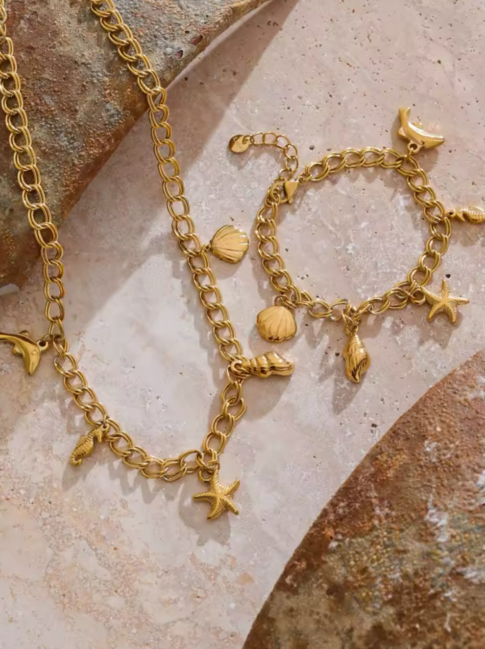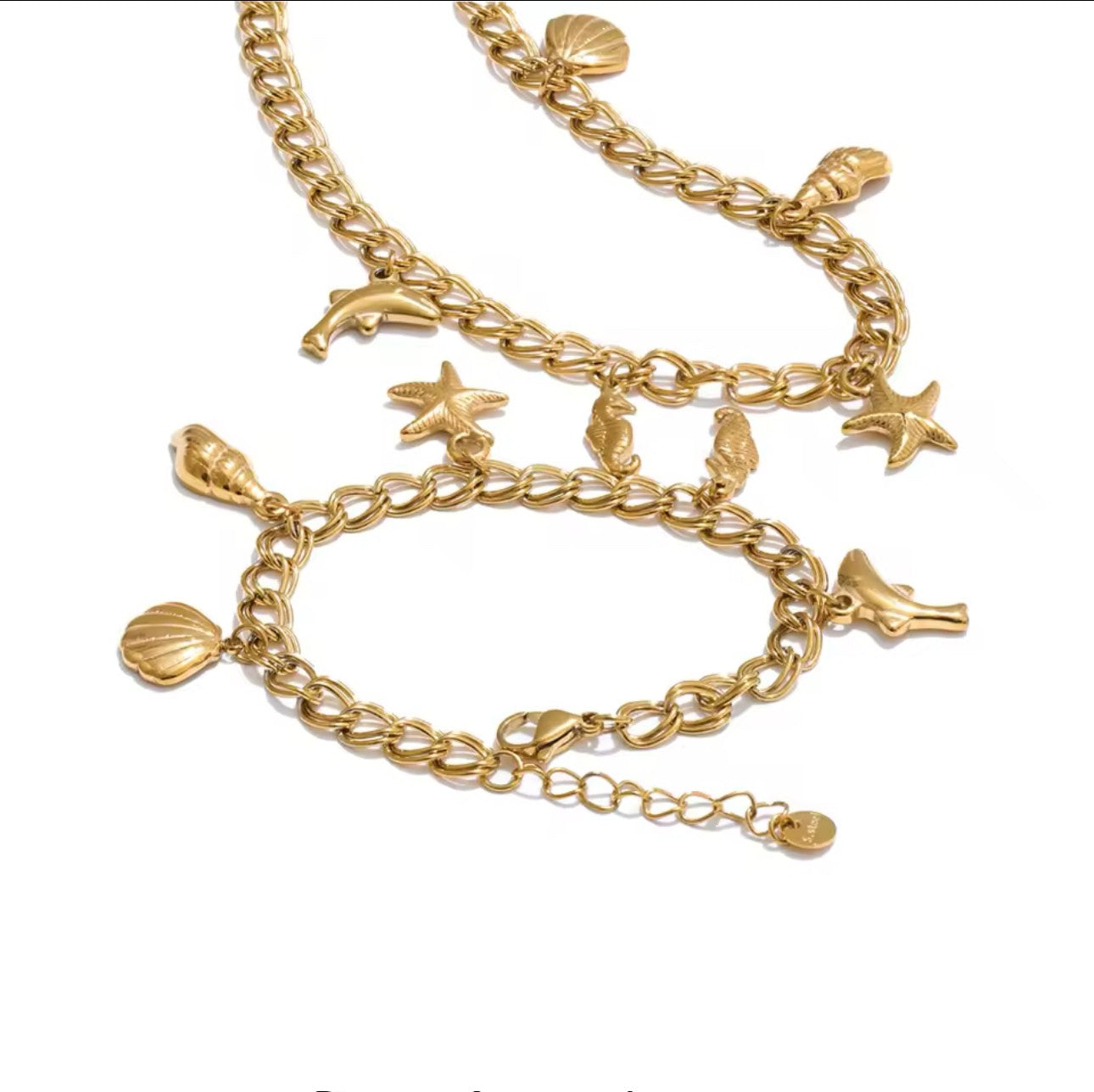Set de cadena y pulsera con dijes de mar de acero inoxidable pvd oro 18 k