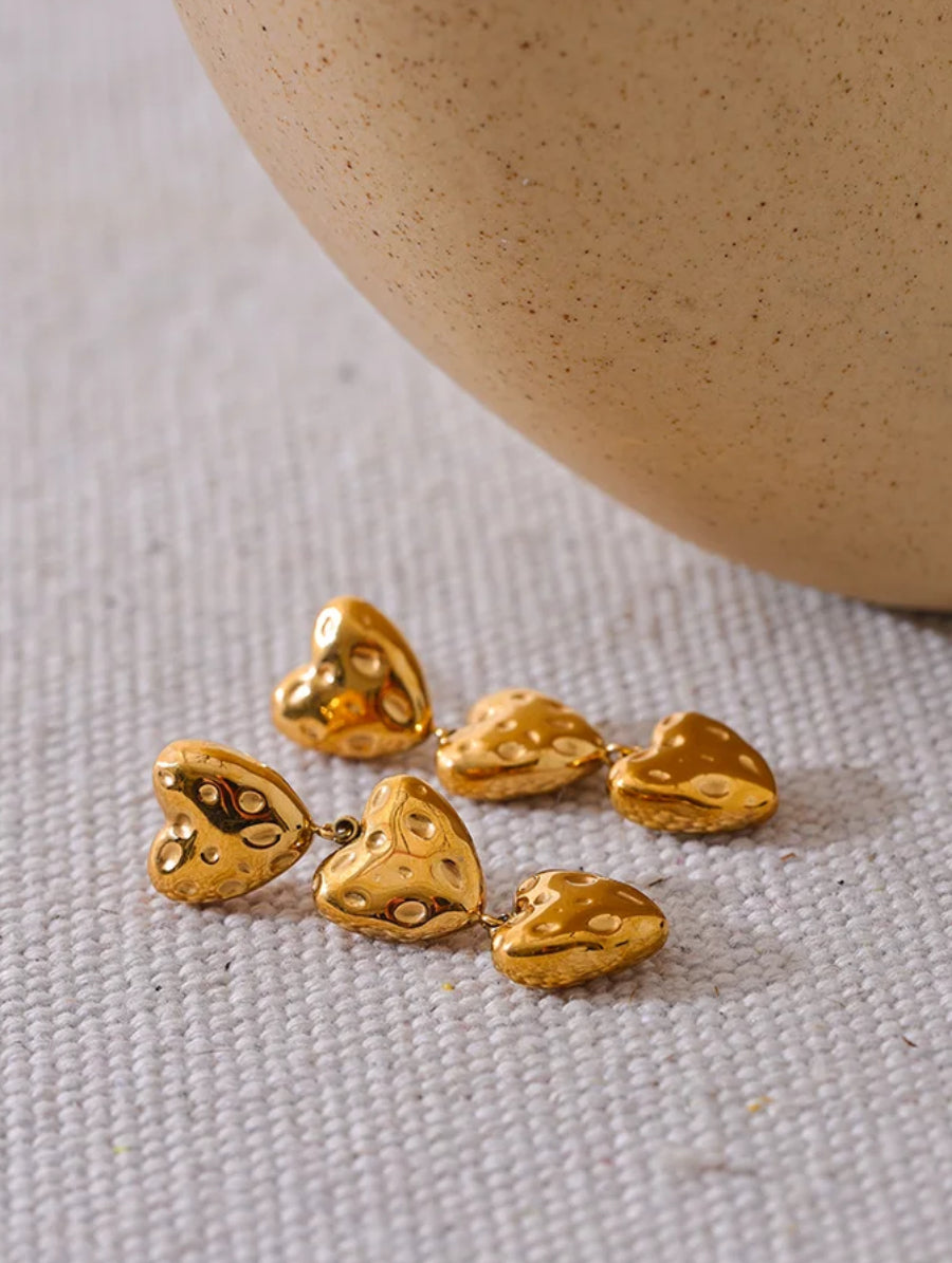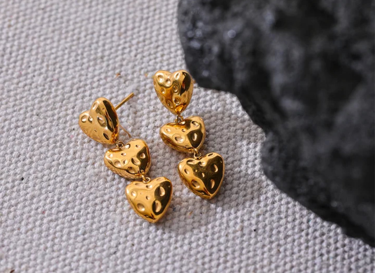 Los aretes de acero inoxidable PVD 18k vintage Triple Hearts son el regalo perfecto para expresar amor. Con sus tres corazones simbolizan la unión, el respeto y el cariño duradero. Hechos con materiales de alta calidad, estos aretes son una pieza única que durará por mucho tiempo.